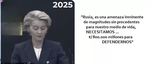 (recuerden estos tres episodios) … siempre buscando la manera de exprimir al máximo el erario europeo en unión de sus correligionarios, [acuérdense], no fue elegida por nadie … es muy importante, porque ahora los quiere obligar a esto … REARME EUROPEO, PARA PROTEGERSE CONTRA UNA AMENAZA DE QUIEN ADVIERTE DE ESTA MANERA …