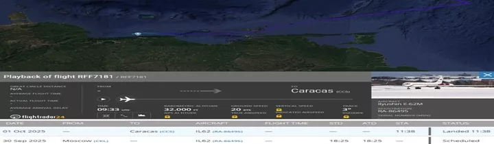 matrícula RA-86495 … Avión de la Fuerza Aérea de Rusia, aterrizó en Maiquetía tras largo viaje desde Moscú … Este miércoles en el Aeropuerto Internacional Simón Bolívar de Maiquetía (edo. La Guaira), el monitor de tráfico aéreo FlightRadar24 registró el momento en que la aeronave encendió su transpondedor en medio del océano Atlántico antes de su llegada a Venezuela a las 11:30 A.M. – El avión Ilyushin Il-62M, con capacidad entre…