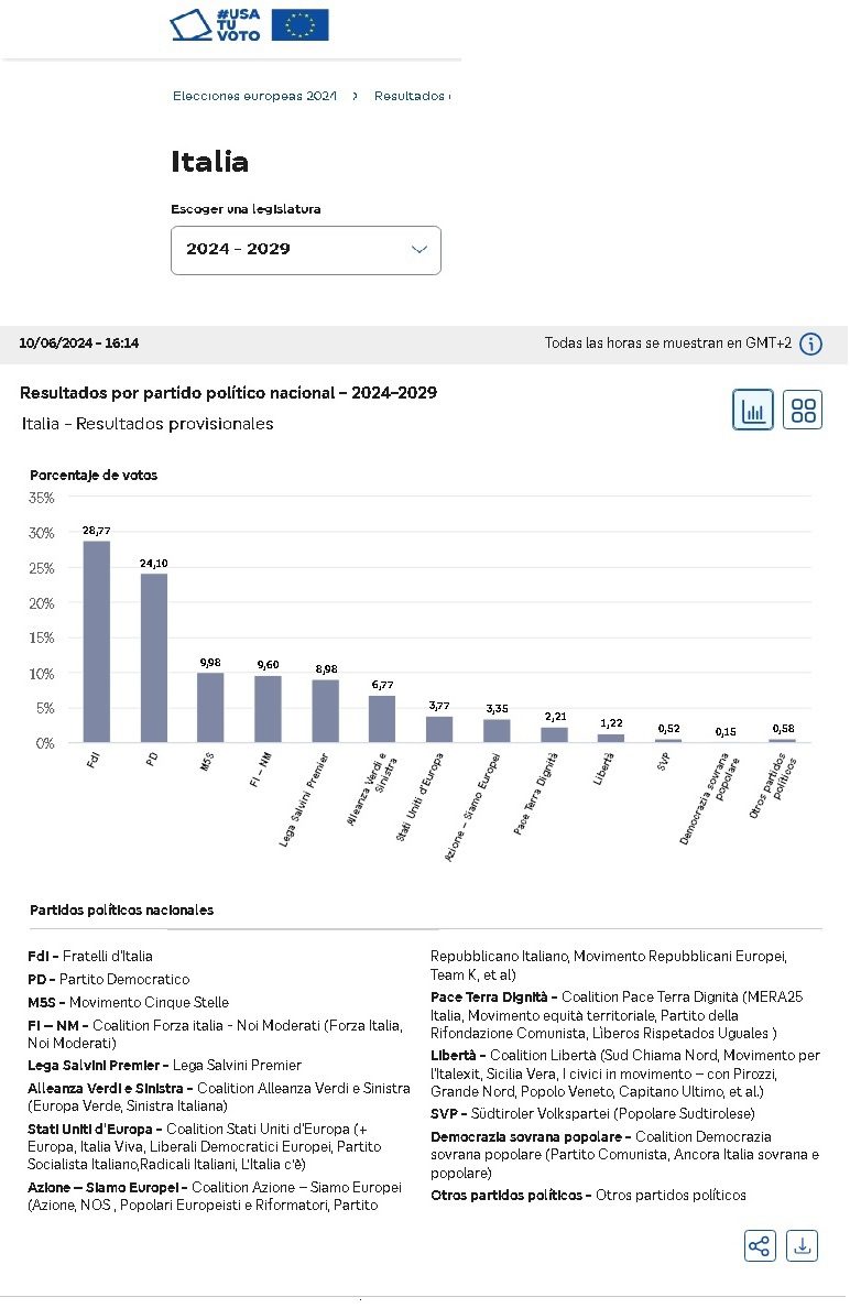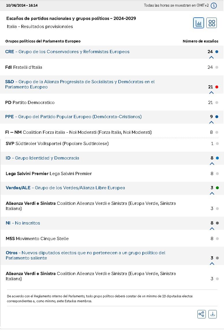 Composizione del Parlamento europeo in base ai risultati nazionali provvisori o definitivi pubblicati al termine delle votazioni in tutti gli Stati membri, sulla base della struttura del Parlamento uscente. Secondo il regolamento del Parlamento, un gruppo politico deve comprendere almeno 23 deputati eletti da almeno sette Stati membri.